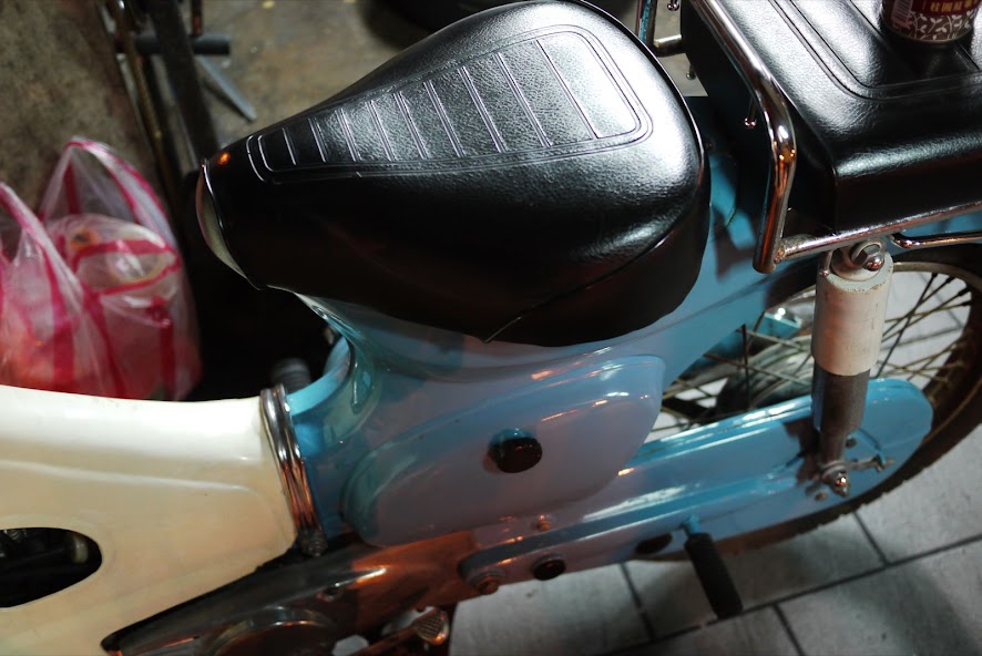 當天跟坐墊老闆溝通的做法當然就是要仿舊的感覺,所以依照前面座墊的作法,應該是要有一個拉邊,也就是會凸起來圍著邊邊一條的那種復古樣式。就像以下照片這個前座墊一樣的邊條。)